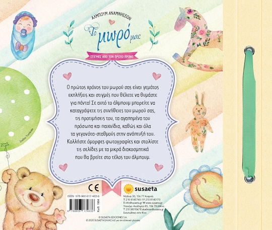 Ο πρώτος χρόνος του μωρού σας είναι γεμάτος εκπλήξεις και στιγμές που θέλετε να θυμάστε για πάντα! Σε αυτό το άλμπουμ μπορείτε να καταγράψετε τις συνήθειές του, τις προτιμήσεις του, τα αγαπημένα του πρόσωπα και παιχνίδια, καθώς και όλα τα γεγονότα-σταθμούς στην ανάπτυξή του. Κολλήστε όμορφες φωτογραφίες και στολίστε τις σελίδες με τα μικρά διακοσμητικά που θα βρείτε στο τέλος του άλμπουμ.